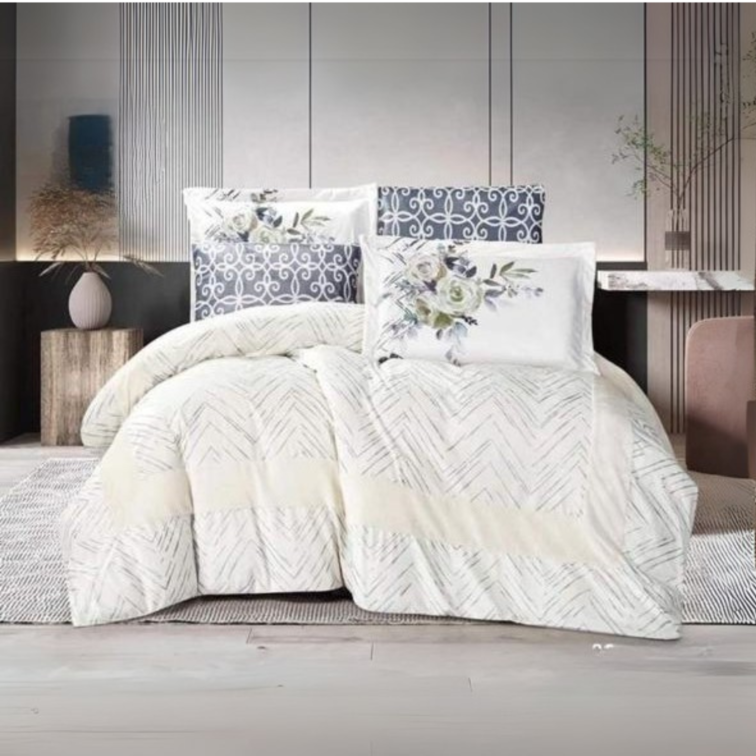 طقم غطاء سرير كينج 6 قطع غطاء سرير 250 230 سم ملف فرشة 200 200+25 سم وجه وسادة عدد 2 معرق 50 70+5 سم وجه وسادة عدد 2 50 70 سم